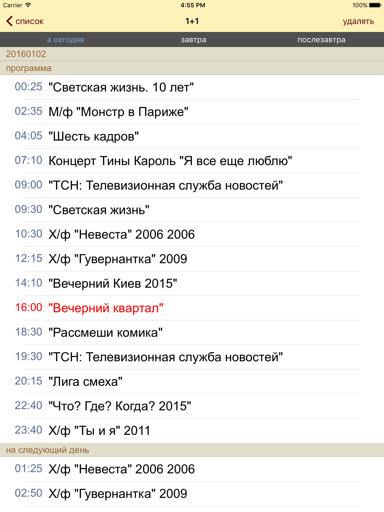 The application provides you navigate ukrainian television programs over 150 channels. Schedule all movies, shows, news releases, and other interesting stories you can monitor on-line on our application. Channels include: 1+1,2+2,ICTV,Zoom,K1,K2,5 канал,A-ONE,Business...