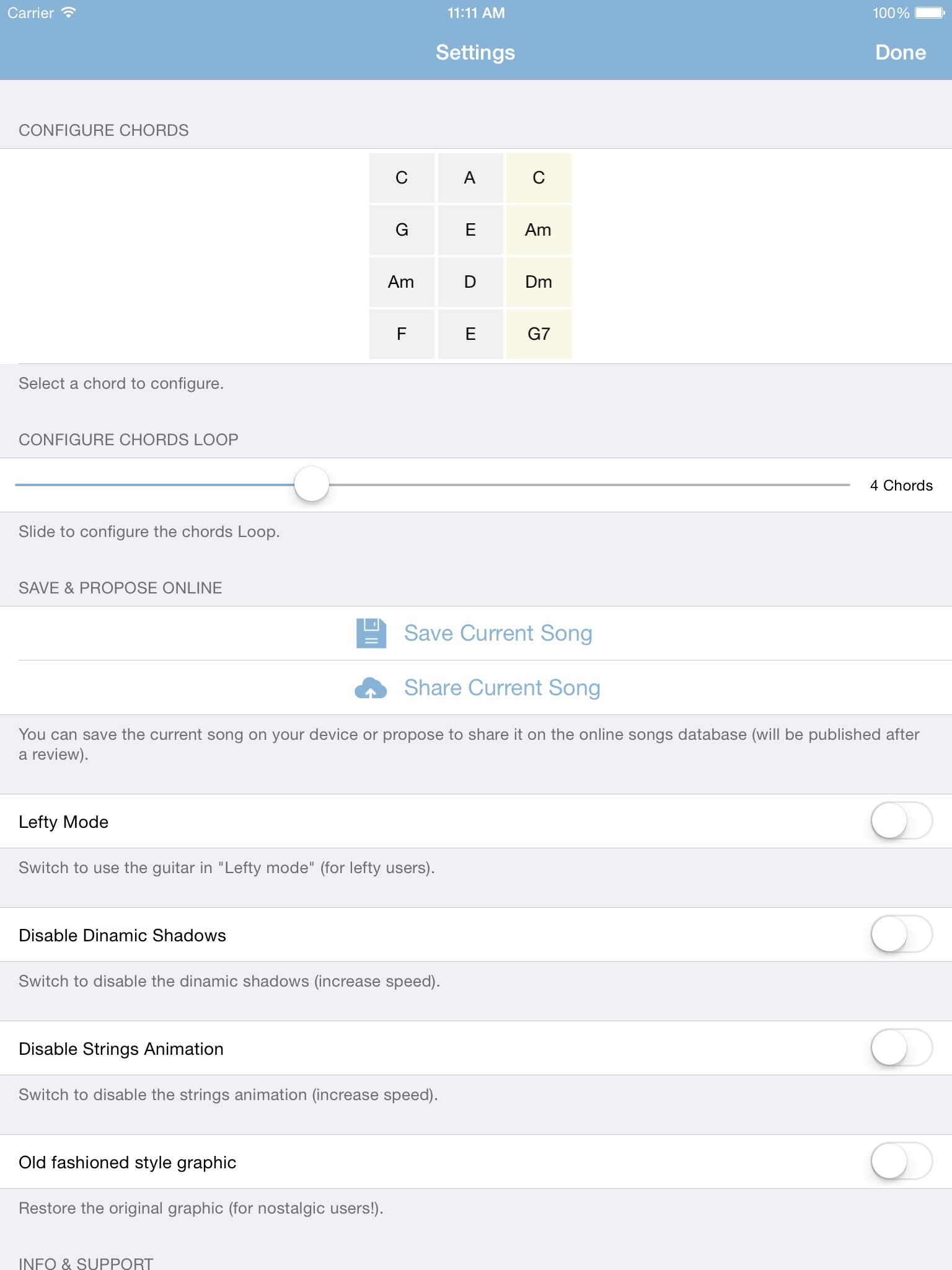 This function is useful to play your favorite song. You just need to program the chords, shake your iPhone and loop at time through them, tapping just a button.