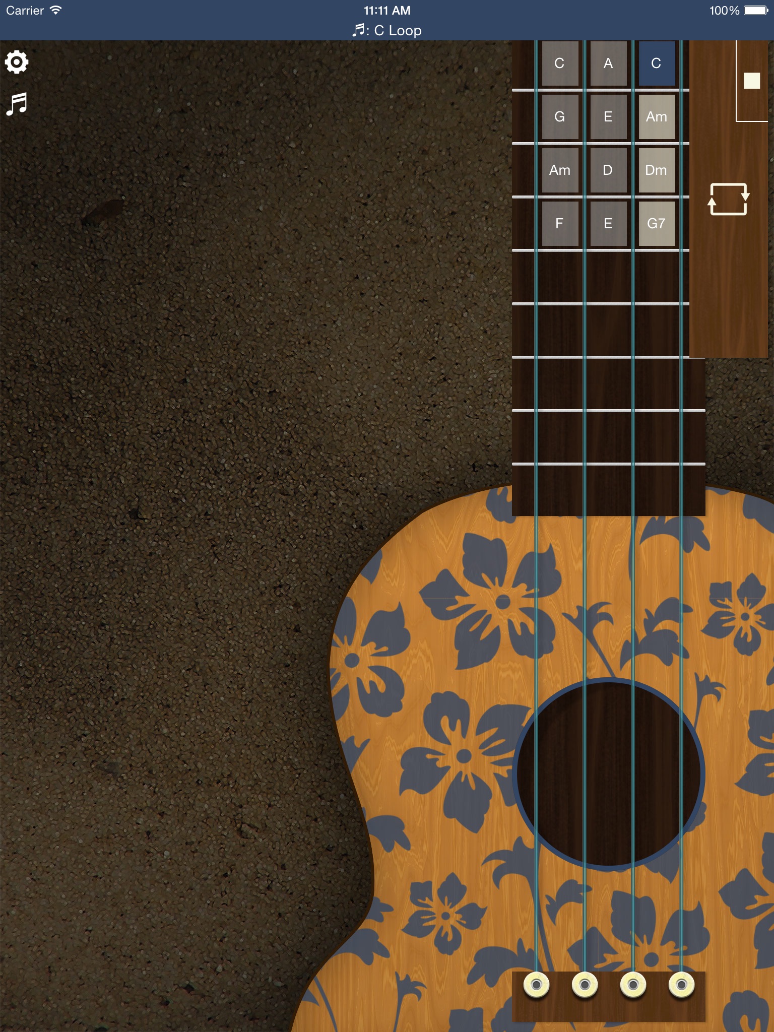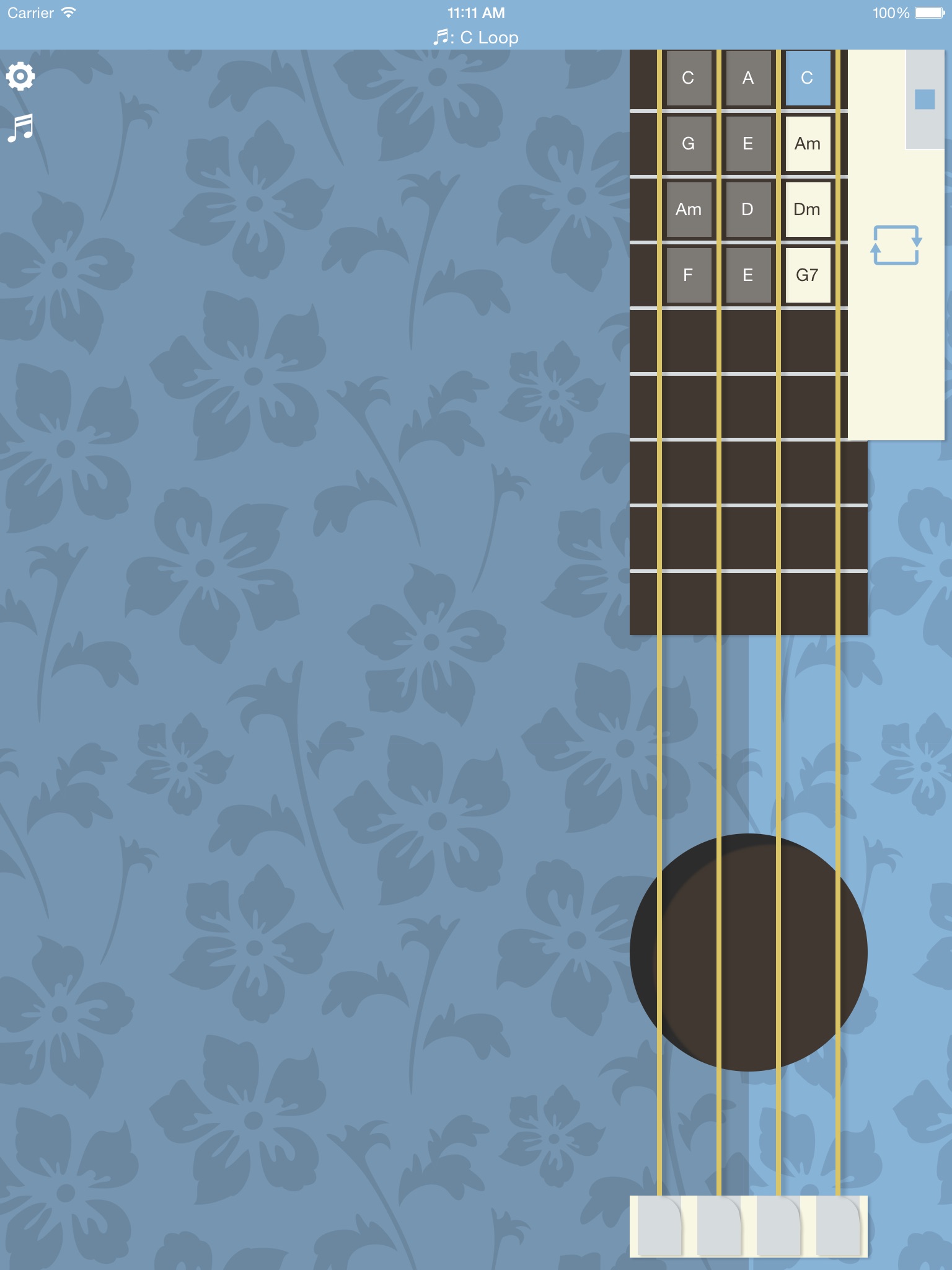 3. Finally, on the Ukulele view, touch the big metal chords-holder to loop through the programmed chords (showed in light brown color).