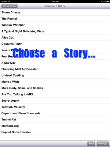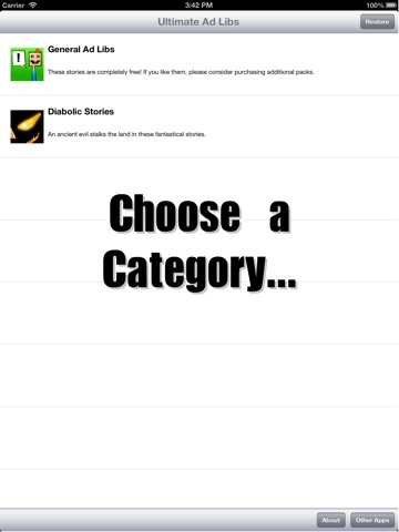 Ultimate Ad Libs is the best ad lib-style game on the App Store! Simply enter a few words at the prompts and then let Ultimate Ad Libs create a crazy story for you. A general set of 20 stories is included, with extra categories of stories unlocked with additional purchases.