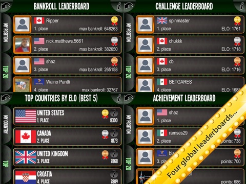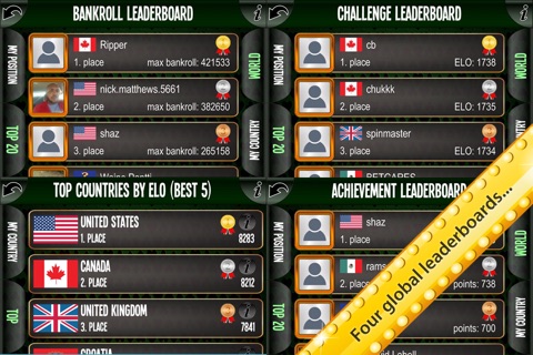 * four leaderboards (bankroll, achievements, ELO, country!)