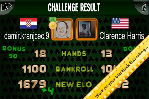 Get your blackjack ELO rating and try to climb the "Challenge leaderboard", help your country on the "Country leaderboard"!