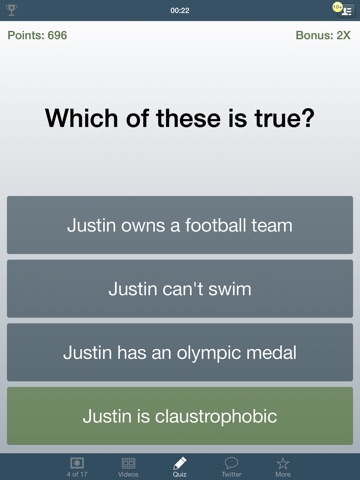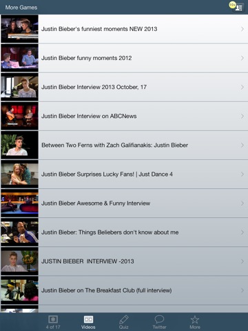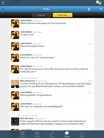 TWITTER - If you ever want a break from all of the other fun features, then you can check out the Twitter tab for an instant look at Justins twitter page! You can even interact with all of your favorite Twitter features without ever leaving the app!