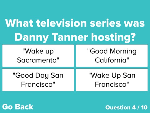 See if you can identify the different characters and plot points of the show, correctly answer questions about Comet, Aunt Becky, Kimmy Gibbler, Wake Up San Francisco, Jesse and the Rippers, and all the friends, relationships, and family bonding moments over 8 seasons of 192 much loved episodes!