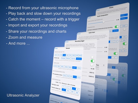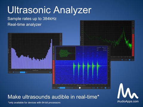 Ultrasonic Analyzer is a real-time spectrum, spectrogram, oscilloscope, and octave RTA analyzer for your iPhone or iPad. It provides a visual representation of ultrasounds using a sampling rate of up to 384kHz**. You can listen to transposed ultrasounds* and analyze them in real time. For sounds that are normally inaudible, a slowed-down playback option is also available.
