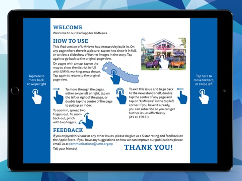 UMNews is published quarterly and gives updates and news of the United Mission to Nepals (UMN) work. Through this app you will be able to access each new issue of UMNews, back-issues and also other publications like the Annual Report, Prayer Diary and our Prospectus Booklet, all completely FREE!