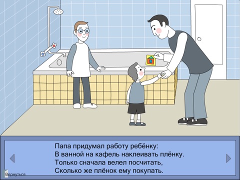 «Схема». Третья часть нацелена на осуществление постепенного перехода от игровой ситуации к математической проблеме. Она реализуется так же в в виде набора слайдов, визуальное решение которых основано на художественных образах, знакомых учащемуся по предыдущим частям. При этом в нижней части слайдов добавлены схематичные иллюстрации, которые предоставляют возможность учащемуся проследить, как решение проблемы, поставленной в рамках игровой ситуации, реализуется математическими методами. Такой подход призван облегчить учащимся формализацию решаемой проблемы, поддержать переход от конкретной ситуации к ее математической трактовке и как следствие способствуют переходу от ситуационной модели к математической.