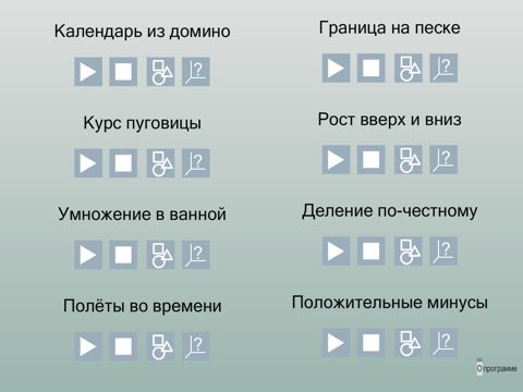 Интерактивное приложение состоит из восьми блоков, каждый из которых посвящен одной из тем, изучаемых в курсе математики 5 класса: "Счет, цифры, позиционные системы счисления", "Меры", "Обыкновенные дроби", "Действия с натуральными числами: сложение и вычитание", "Умножение натуральных чисел и десятичных дробей", "Деление", "Отрицательные числа, сложение и вычитание", "Умножение и деление чисел со знаком".