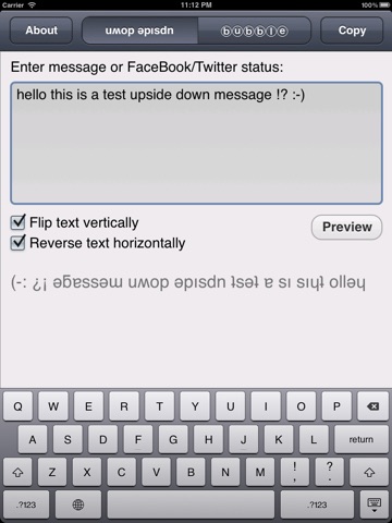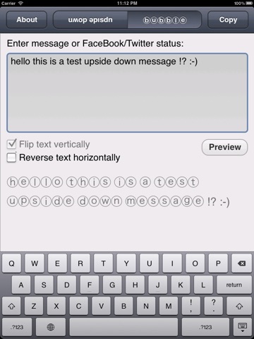 With this small application you can create amazing upside down or bubble style text messages on your iPhone or iPad. With copy and paste you can use them in any iOS application. Your messages will display correctly in all modern E-Mail clients, Mobile phones, Web browsers, etc.