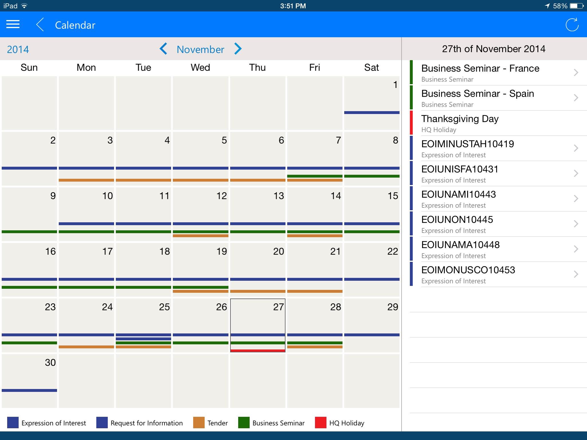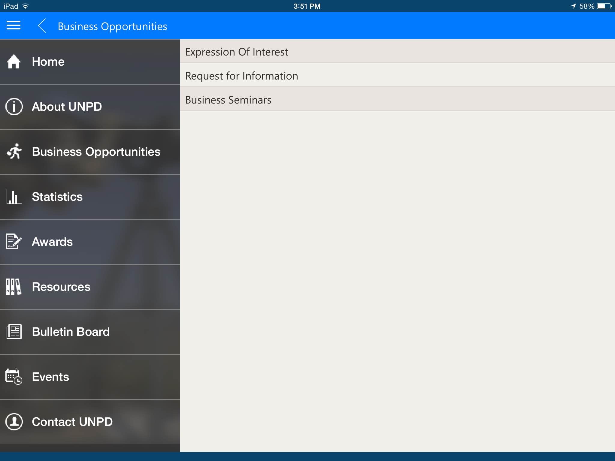 The "UN Procurement" App offers real-time access to information related to business opportunities and strategic sourcing such as requests for expression of interest, future projects, business seminars, tenders, bids and contract awards. The App gives vendors and suppliers a tool to share and transfer information internally on the go. The App also includes contact information on UN buyers.