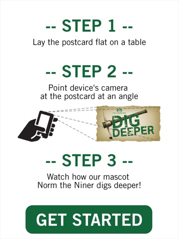 Watch Norm the Niner Dig Deeper and celebrate UNCC pride! Run this app and point the devices camera at the Dig Deeper postcard to have Norm the Niner appear.