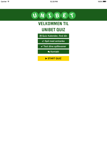 Unibet QUIZ og QUIZ Kalender er et gratis interaktivt koncept der gør det muligt at quizze med andre via en storskærm eller TV. Din egen smartphone, fungerer som controller for aktiviteten. Ved hjælp af quizkalenderen kan du finde den næste aktuelle quiz nær dig. Deltagelses vil blive annonceret på en fælles synlig skærm på udvalgte lokationer eller på dit eget tv eller computer. Det er gratis at deltage i Unibet QUIZ og er et alternativ til Unibets betalte spil. Der vil være præmier at vinde for de hurtige og dygtige deltagere.