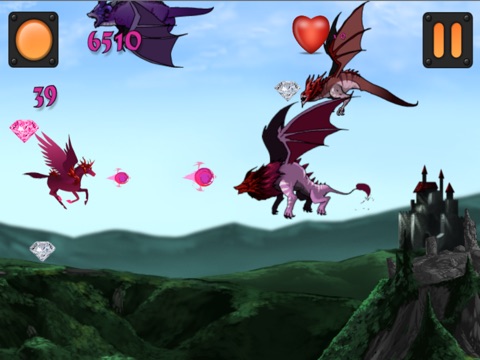 Help the flying unicorns save their land and castle as the dragons fly in to attack. Fly and shoot the dragons with your magic powers and collect diamonds for points. Build your team and access more unicorns as you collect more diamonds.