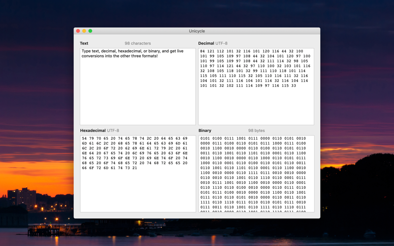 Convert between text, decimal, hexadecimal, and binary representations of UTF-8 text. An indispensable tool for any developer working with text, including stored files or network traffic. Also a great way to explore the mysterious world of Unicode!