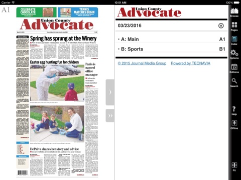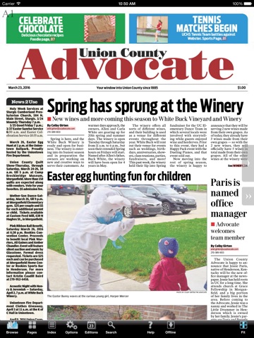 en-US: The Union County Advocate E-Edition lets you read the Union County Advocate on your iOS device just as it appears in print. You can flip through pages and skim headlines as you would the printed edition. But better than that, the Union County Advocate E-Edition allows you to enlarge type with the tap of a finger, or jump instantly to the conclusion of a story on another page. You can link to websites mentioned in stories with a single touch, or fire off an e-mail to an address linked from the newspaper. And if you missed the paper one day, dont worry. The Union County Advocate E-Edition lets you download past editions, too.