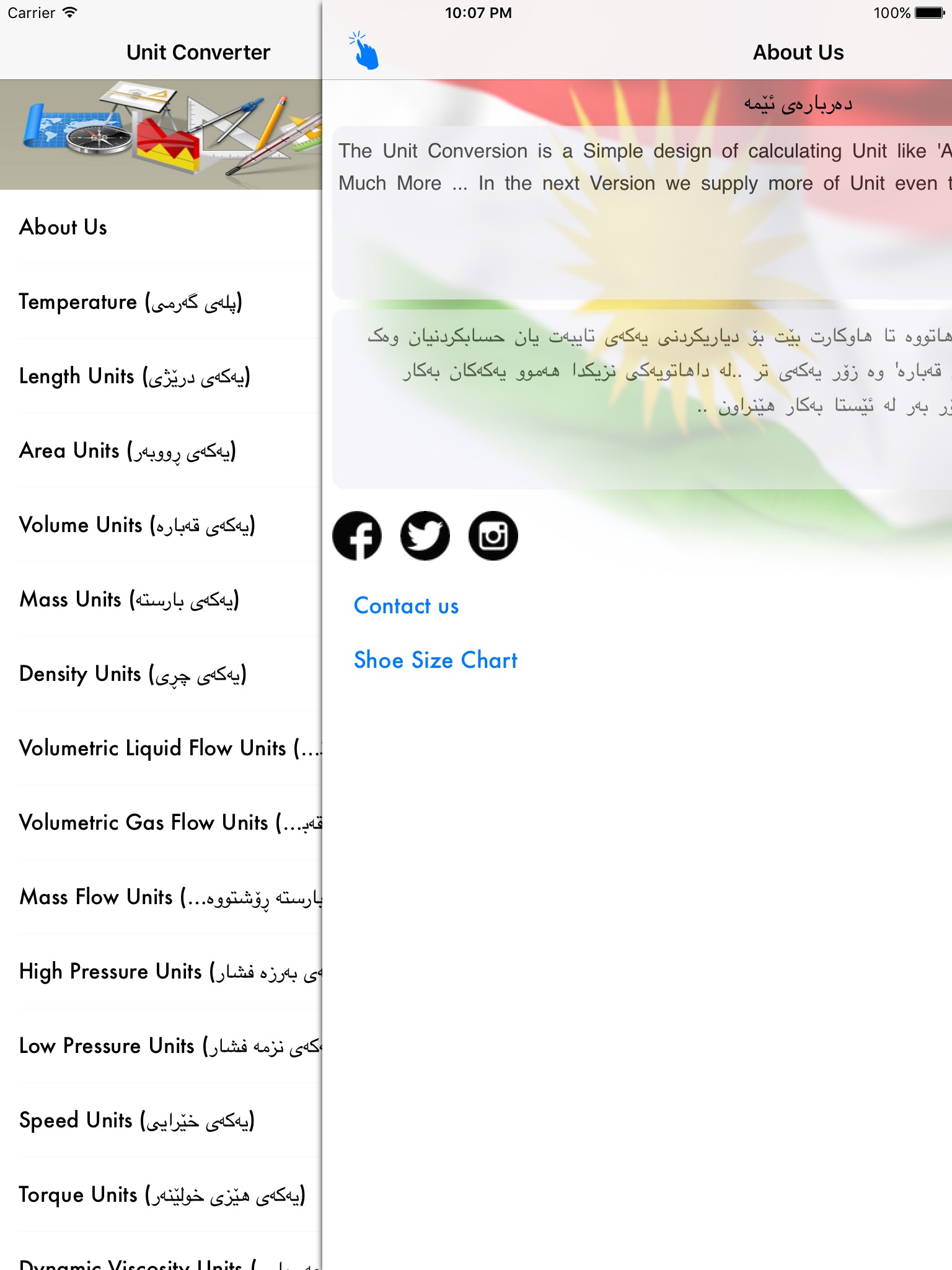 ئەم بەرنامەیە دابەزینی بەلاشە بۆ ئایفۆن وە ئایپاد وە ئایپۆد دیزاین کراوە بەشێوەیەکی سادەو ساکار لە ١٦ بەش پێک هاتووە لە ڕێگای ئەم بەرنامەیەوە زۆر بە ئاسانی ئەتونریت یەکەکان بگۆڕدرێت بۆ ئەو یەکانەی کە ئیوە پێویستان دەبێت