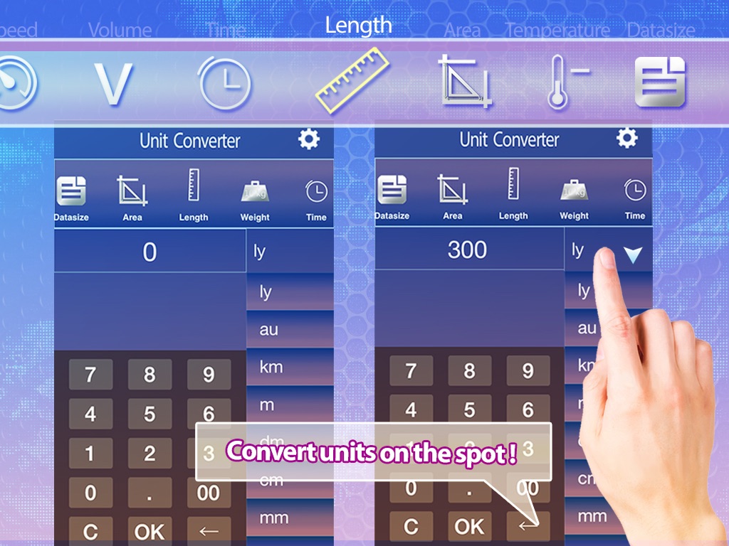 - Supported units: Length, Area, Volume, Weight, Time, Energy, Speed, Temperature, Data, Currency