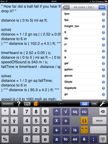 UnitMath also helps you – “Know What You Know” – ‘4.0853334 hours’ is interesting, ‘4 hr + 5 min + 7.2 s’ is more meaningful but ‘( 3.5 to 4.7 ) hours’ is much more useful. With UnitMath you can easily find the uncertainty (the give or take) in your answer. When you know the uncertainty of your answer you “Know what you know”.