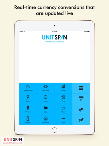 • Unitspan provides simple and functional iPhone and iPad app for converting between Time converter, Temperature converter, Distance converter, Speed converter, Area converter, Mass converter, Power converter, Data converter, Base converter, Energy converter, Pressure converter, Land converter, Currency converter, Angle converter, Volume converter, Torque converter, Fuel converter, Force converter, Heat converter, Radiation converter, Surface Density converter.