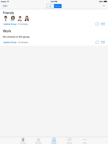 Groups: Create and manage groups, whether they are in iCloud or on your device. Send these groups emails or texts at the tap of a button.