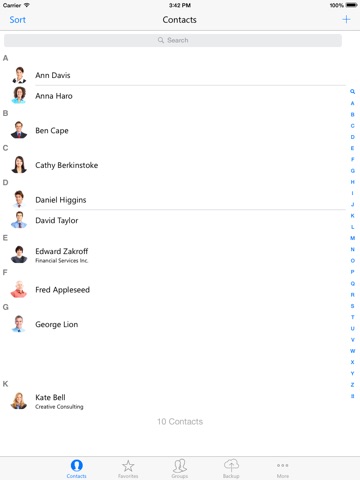 Sort: Quickly find the contacts you need by sorting them by name (last or first), company and even by the day the contacts was created.