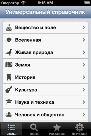 Этот универсальный справочник охватывает практически все сферы человеческой деятельности, что позволяет быстро и легко получить различную информацию из различных областей знаний (физика, химия, география, история, музыка и пр.)