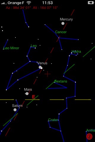 This application shows the 88 constellations and the eight planets (mercury, venus, mars, jupiter, saturn, neptune, uranus, pluto) + the moon and the sun at their exact position at the time and date of your iphone/ipod Touch.