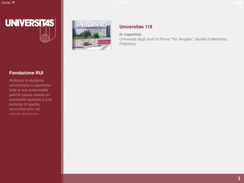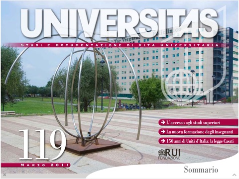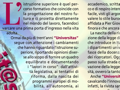 La versione iPad di UNIVERSITAS ripropone i contenuti della rivista cartacea e ne consente la lettura in forma ancora più agile, grazie a un visore che permette di selezionare visivamente qualunque pagina in base al suo contenuto. Le pagine possono essere ingrandite a video per agevolare la lettura degli articoli e la rivista può essere consultata con iPad in posizione verticale od orizzontale.