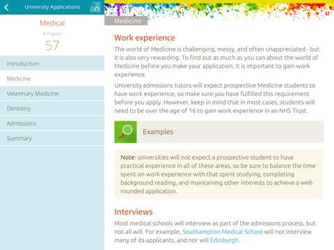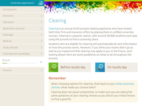 The app leads students through subject and university choices, with questions and links to resources to direct thinking and research. Detailed information is given about the application process, and guidance is included for medical courses, studying abroad, and how student loans are managed. A dedicated section explains the mysteries around applying to Oxford and Cambridge.