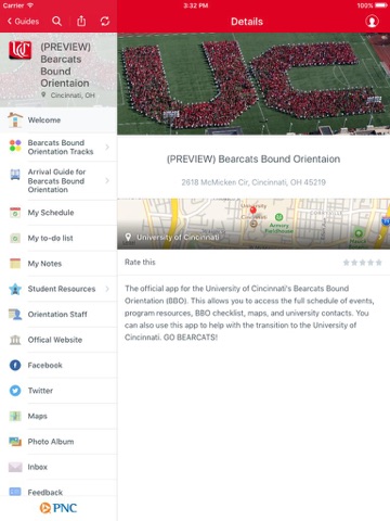 The official app of the University of Cincinnati. This app is used for Bearcats Bound Orientation (BBO) as well as other events and programs at the University of Cincinnati. Access event schedules, program descriptions, campus resources, checklists, maps, and university contacts. GO BEARCATS!