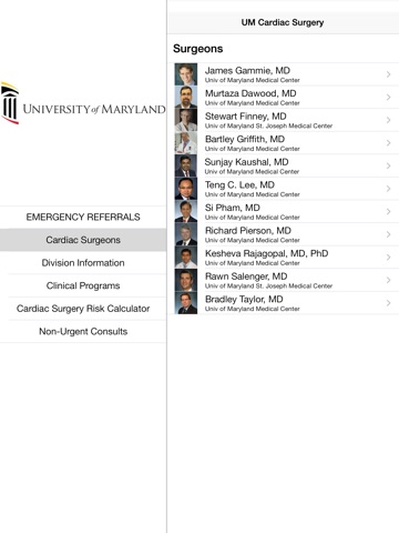 The University of Maryland’s Division of Cardiac Surgery developed this app to offer referring physician’s immediate access to our faculty and clinical resources at all hours of the day with phone numbers for both urgent referrals and non-urgent consults.