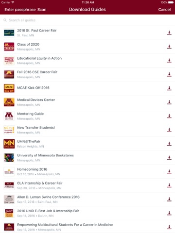 The University of Minnesota uses Guidebook to communicate special events and programs taking place on campus. Look here for your event schedules, the latest news, highlights, lists and descriptions of speakers and exhibitors. Integration with social media.