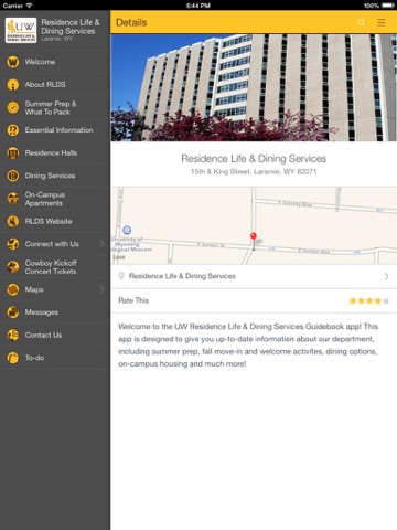 Welcome to the University of Wyoming! The UWyo Guide is designed to be a valuable resource for campus information. Whether youre a prospective, first-time or returning student, enhance your campus experience by downloading the app for instant access to things like orientation programs, living & dining on-campus, student leadership opportunities, event calendars, campus maps and much more!