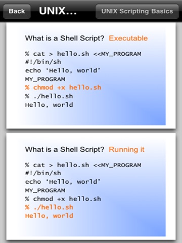 I got this app to use as a reference. It is basically what u see in the screenshots only 71 pages of it. Not written very well or using images that are too big to scroll through without that buggy hesitation. It is a very large file for what the app does (14.1Mb) Was disappointed that there was no search or glossary. You get what you see. Slides are written well and pretty helpful. I havent tried the other unix schell reference apps so I cant tell u if its better or worse than the cheaper ones. This is a relatively new app to the AppStore, 4 days old as of this review. Hopefully developer reads this feedback and creates an update in the near future that addresses the issues I discussed.