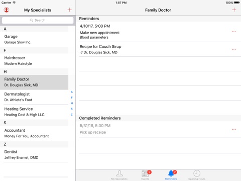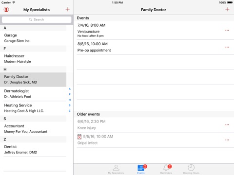 Without this app you will never go to the doctor! Manage easily and efficiently your specialists: your doctors, your garage, your accountant, etc.