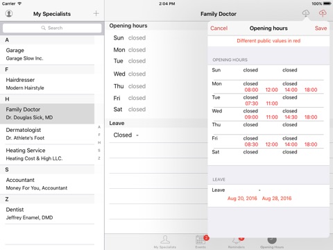 Save opening hours and holidays of your doctors or your garage directly in Uno Actu, and share them with other users of the app in the community.