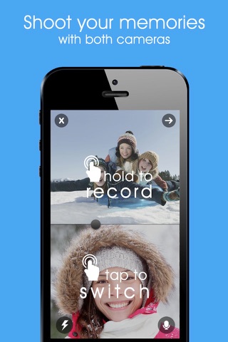 • Capture-pause-switch-capture-create using front and back camera, in any order and create a single merged clip up to 6 seconds.