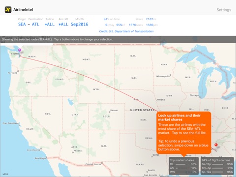 • Aircraft intelligence - Get market stats for any type of aircraft. Find out what aircraft are flown by each airline in a market.