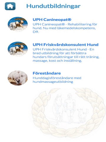 UPH står för kvalitetssäkrande av terapeuter inom hästutbildning, hundutbildning samt humanutbildning. Vårt mål är att fackkunnigt folk med förtroende ska kunna vända sig till av UPH utbildade elever och få adekvat behandling.