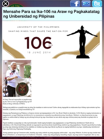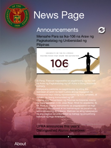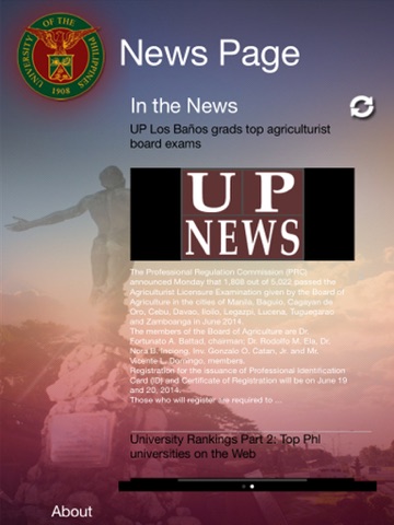 UP NewsApp is a mobile application that displays the latest news found in the website (up.edu.ph). It allows the user to share each news to facebook, twitter and email. Internet connection is needed.