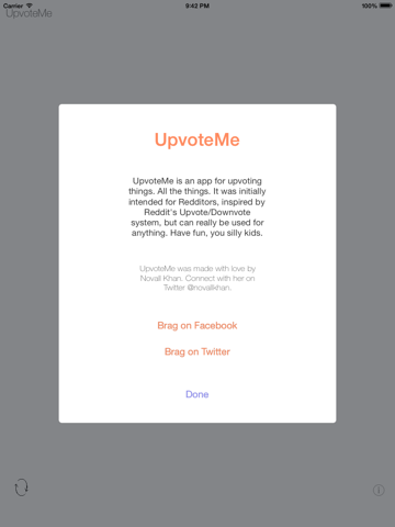Inspired by Reddits upvote/ downvote system, UpvoteMe provides a quick way to upvote things IRL.