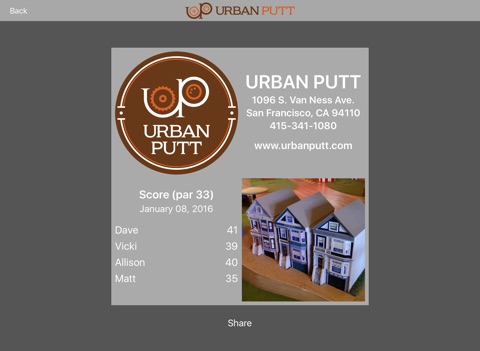 During your visit, use the app to keep score for your group and when youre done... post your game summary to Facebook, Twitter or establish bragging rights by sending your score to your friends via Messages or email.