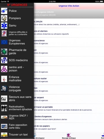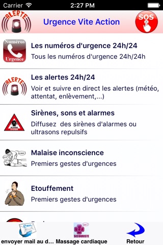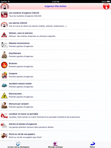 Tous les premiers gestes durgences sont intégrées dans la racine de lapplication et sont donc accessibles sans nécessiter de réseau ou connexion (donc 24/24h) ou que vous soyez, même en zone blanche, avec coupure du réseau téléphonique ou en plein désert.
