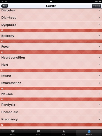 It translates in all major languages of the world and uses the anamnesis-system of «SAMPLE» and «OPQRST». Theres also a dictionary with the most important adjectives, times, body parts and diseases.