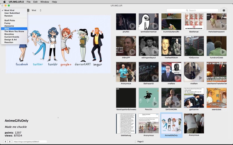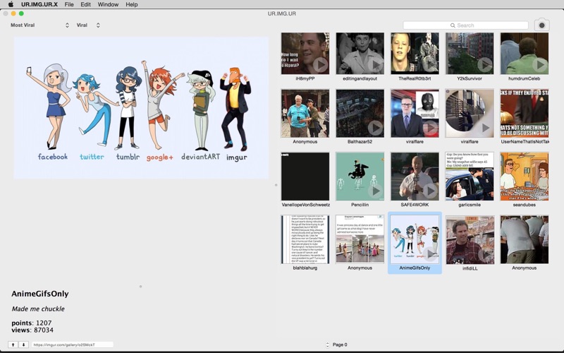 Anonymous IMGUR client for Mac OS X compatible with Snow Leopard (10.6) and later. Allows browsing of images and videos, upvoting & down voting and anonymous meme image uploading with integrated selfie snapper.