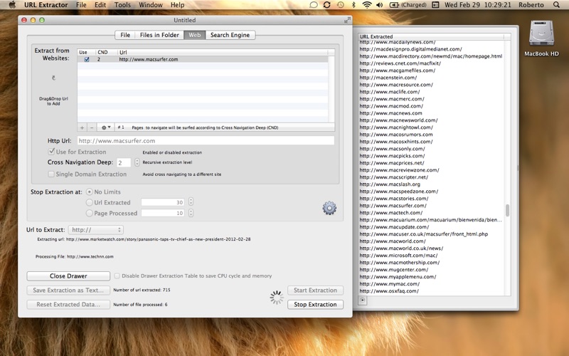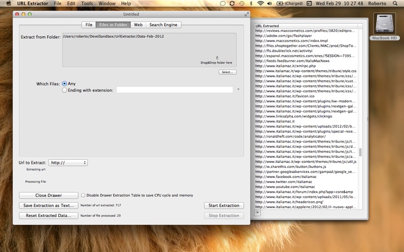 URL Extractor is fully compatible with OS X 10.7 Lion and OS X 10.6.6 Snow Leopard and uses an internal multithread engine developed for OS X by Tension Software for the purpose