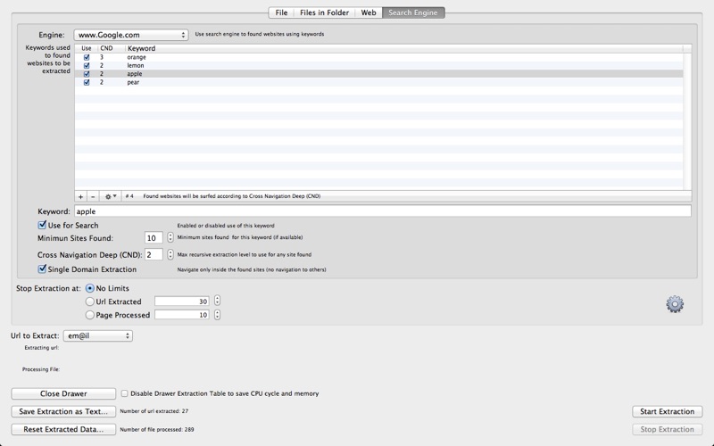 A very important thing is that URL Extractor is a document based app. That means the user can create a document for any search, containing all the settings used and use it at later time to repeat the search and collect updated results from the web and also from local files if case they were updated.