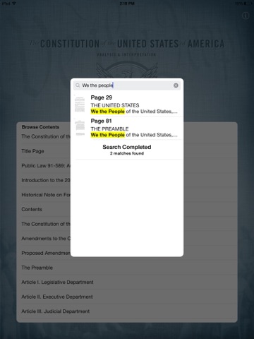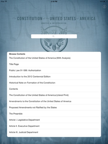 The U.S. Constitution: Analysis and Interpretation app is a mobile version of the "Constitution of the United States of America: Analysis and Interpretation", a comprehensive analytical legal treatise prepared by attorneys of the Congressional Research Service at the direction of the United States Senate and issued as Senate Document No. 112-9. The app is presented by the Library of Congress using data provided by the Government Printing Office.