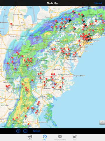 > Click on the Map tab and Alerts around the globe are listed. Zoom in/out and select any alert to see the latest weather information. Please notice alerts are being loaded dynamically, you can use "Refresh" button to refresh the latest alerts on the map. If you prefer to view alerts in different map type (Normal, Satellite, Hybrid and Flyover). Click on the "Map Type" to start to switch to different map type.