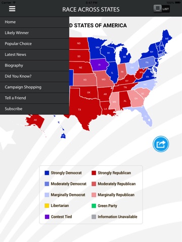 You will get to know how the Presidential candidates are doing in the Polls in the run up days to the election day. See who leads or trails across various states in USA. It will take 270 electoral votes to get into The White House. This app tracks that number and makes a prediction for the NEXT PRESIDENT OF UNITED STATES. Tune in daily to view and track the poll numbers to see which candidate has the best chances to be the next President. This is the best app that brings you the polling results till the election day.